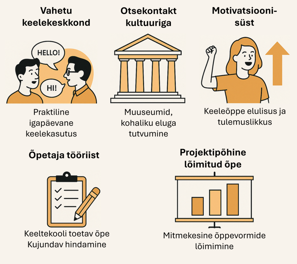 - Motivatsioonisüsti – õpilane kogeb, et keel „toimib“, mistõttu suureneb püsiv huvi ja valmisolek pingutada.